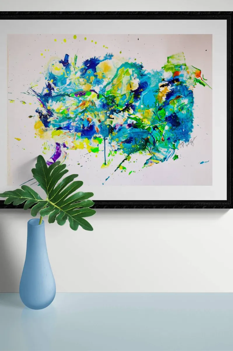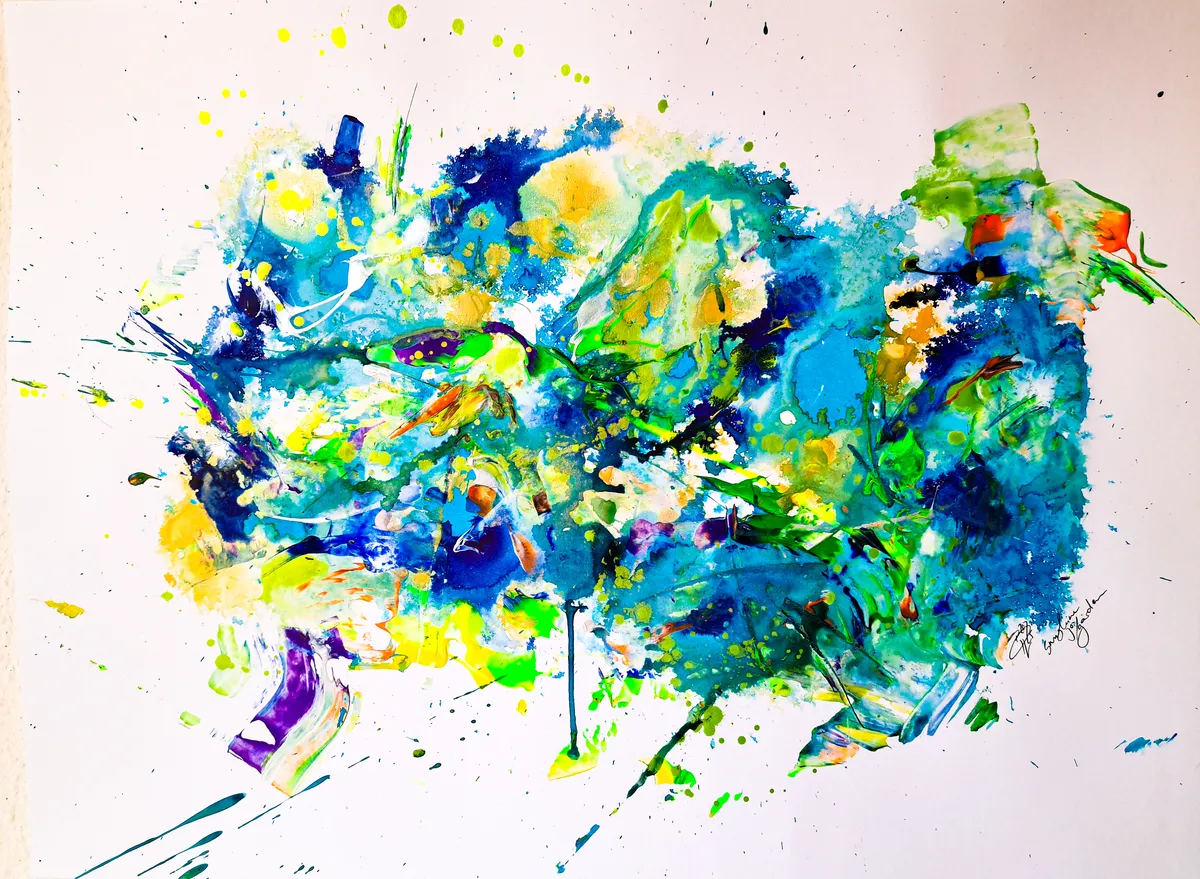 Mixed media on heavy-weight art paper, 300g/sqm - unframed - inquire for shipping - copyright barbaraharderlutz Inspired by the summer painting in the garden - sessions, here now an intuitive, energetic abstraction expressing my joy about summer and the fabulous garden I worked in.