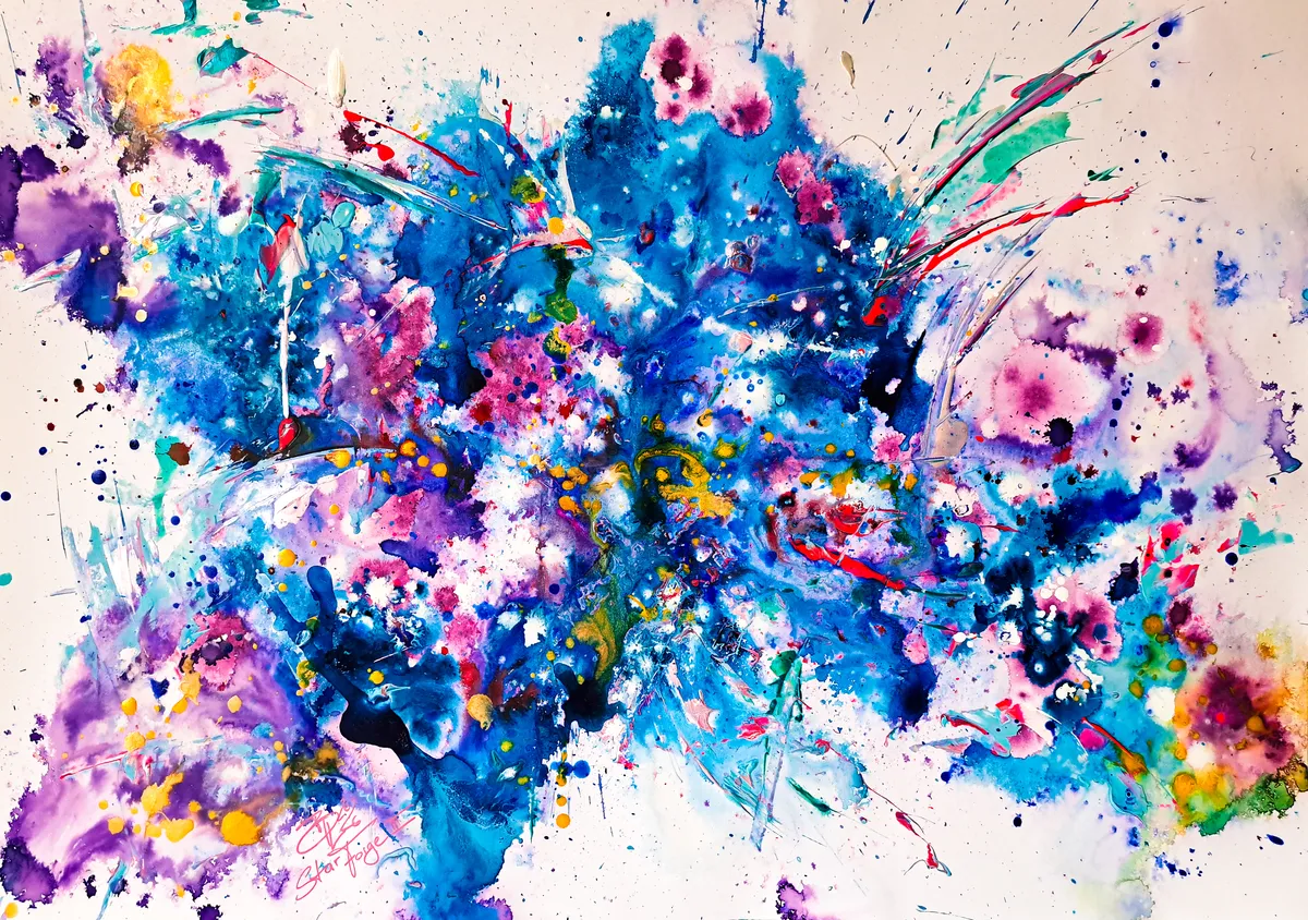 Shimmering pearl acrylics & acrylics on doree paper - Energy, colors splashing onto the art paper, feel the artist working out her inner demons!